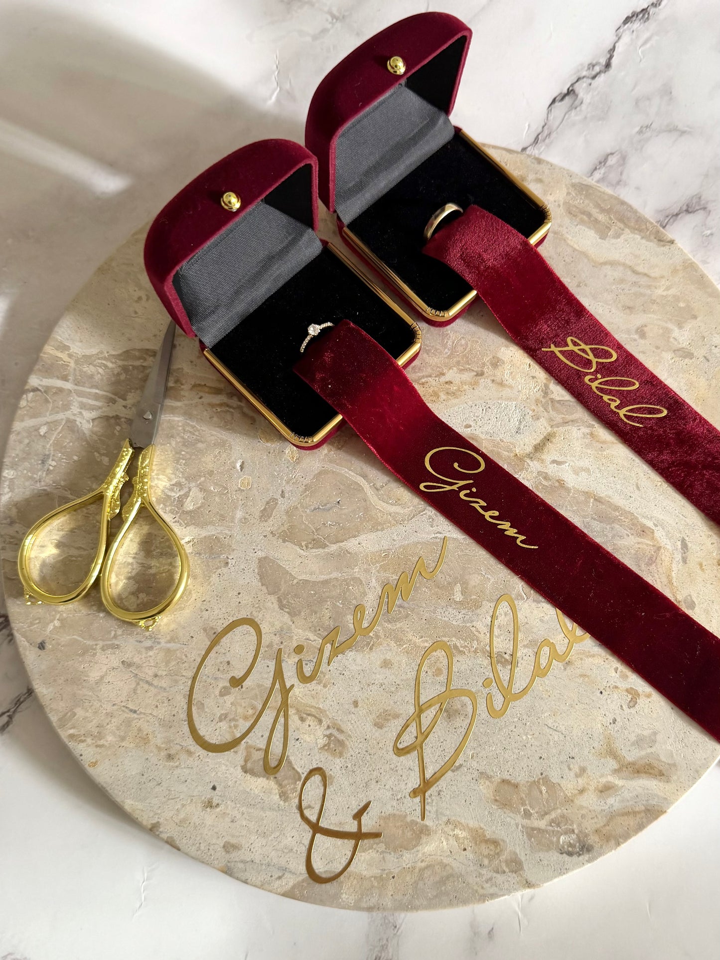 Feiere deine Verlobung mit einem besonderen Highlight: unserem stilvollen Verlobungstablett mit personalisierten Ringschachteln, Band und goldener Schere.